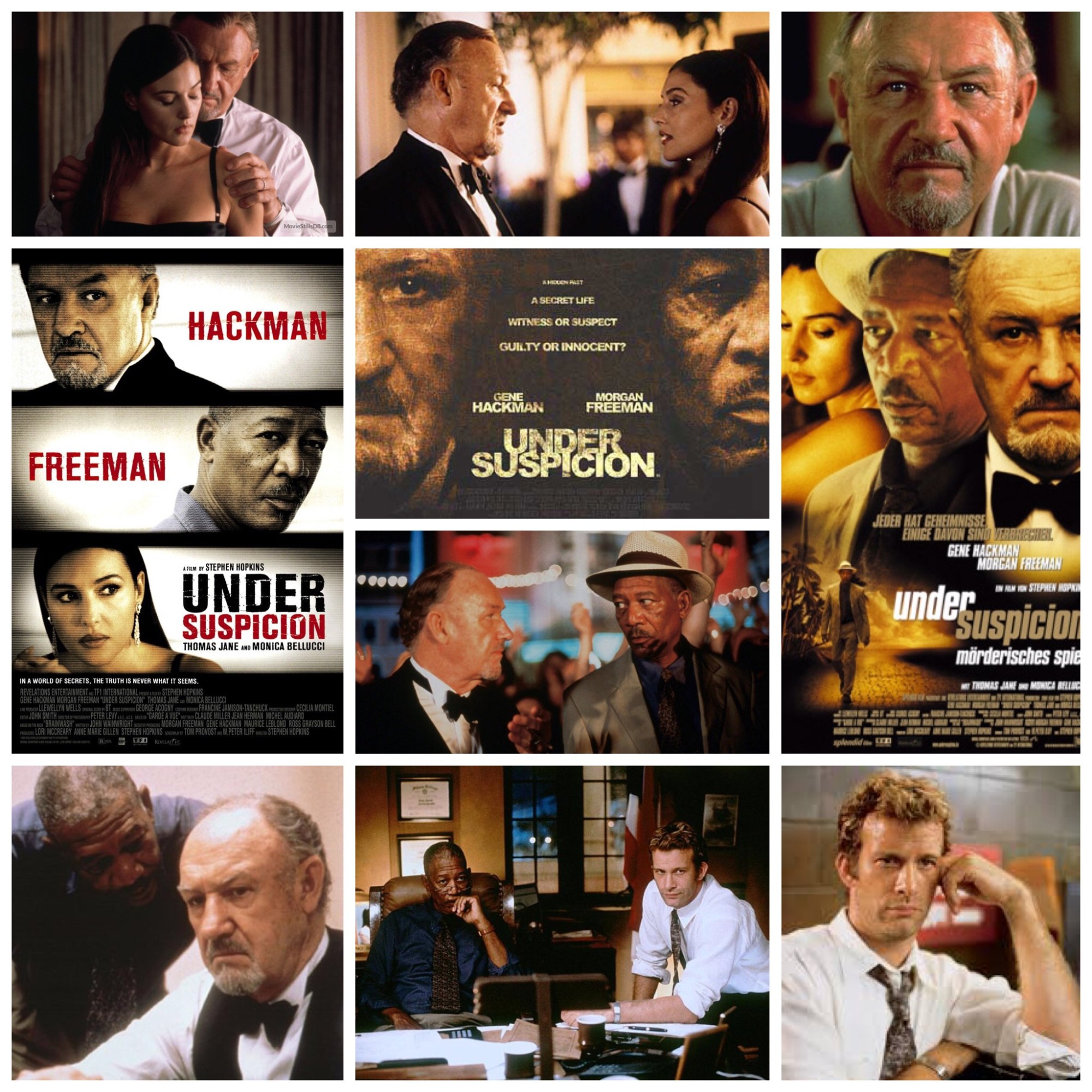 If Stephen Hopkin’s Under Suspicion were a meal I was served at a restaurant, I would throw it against the wall, flip the table, walk promptly back to the kitchen and knock the chef out cold. It’s a hollow, pointless piece, like digging into a pie that’s put before you only to find that under that layer of crust there’s no filling, only air. The premise is promising: wealthy businessman Gene Hackman who has political ties is grilled out of the blue by longtime friend and police detective Morgan Freeman and his partner Thomas Jane, regarding the murder of a thirteen year ago old girl in the slums of San Juan. Hackman is a successful, assured alpha socialite, and these type of men always have some type of close guarded secret which comes to light. Freeman is a dogged working man who probes him until it almost seems personal rather than routine. Sounds terrific, right? You would think. The acting is of course fine, as these guys couldn’t miss a beat if they tried, but the way the story is set up just rips the viewer off blind. These two thespians soar spectacularly, but their duel is structured around purposefully unreliable flashbacks, beating around the bush and oodles of red herrings that treat the audience like sixth graders watching a low rent magician at a birthday party. Hackman has a pretty trophy wife (Monica Belluci, underused) and a host of personal demons that he projects onto Freeman’s simple blue collar rhetoric like a defence mechanism. None of these narrative fireworks can save it though, especially when an ending rolls around that is the very definition of a letdown, through and through. In an attempt to explore the forces that drive a man to the edge of admitting guilt whether he is responsible or not, the filmmakers miss the boat on providing a focused treatise that takes itself seriously with these potentially fascinating themes, instead settling on an overcooked, ultimately vacant that could have been so much more.