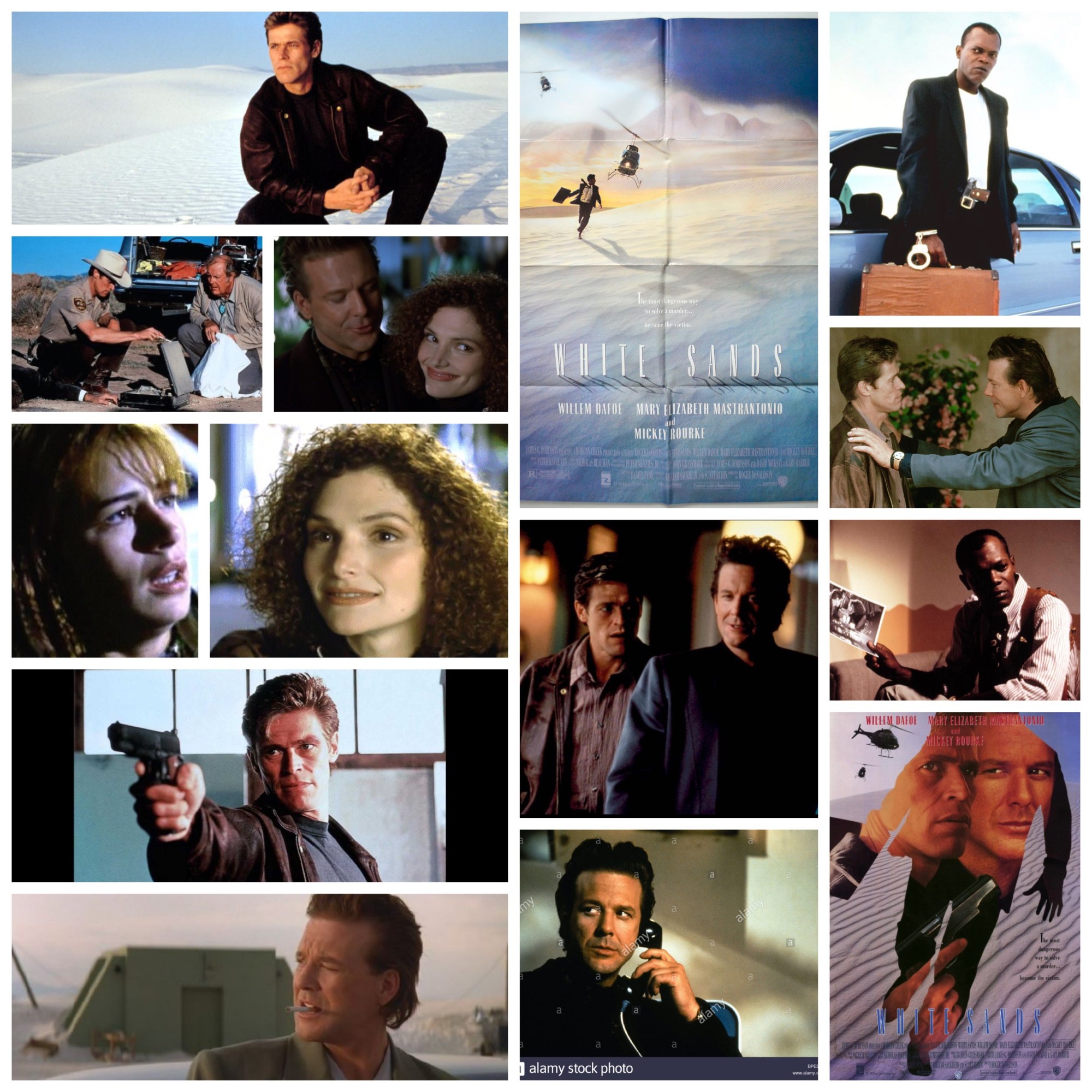 Somewhere out there in the gypsum dunes of New Mexico there’s White Sands, a long lost, slightly unfinished yet captivating neo-noir about small town law enforcement, big time gun runners and everyone else who gets caught up in between. Willem Dafoe is Ray, a bored rural sheriff who sees a way out of the dusty hum drum when an apparent smuggler turns up dead on his watch out there in the national park, prompting him to steal the guy’s identity and dive headlong into the illicit arms business with no real crash course or idea of what he’s doing. A risky move that propels the film down an exciting, sexy, ambient journey of untrustworthy alliances, atmospheric shootouts and a dangerously charming Mickey Rourke as Lennox, the kind of reptilian criminal who’s so good at seducing you into the lifestyle that you don’t realize you’re in the snake pit until it’s almost too late. Dafoe and Rourke have shared the screen aplenty before and while my favourite team up has to be their cartel duo in Robert Rodriguez’s Once Upon A Time In Mexico, this film certainly takes second place honours. They just work so well on camera together, a shaky bromance built on Ray’s deception and Lennox’s unpredictable penchant for violence that proves electric as the narrative weaves around them. The always phenomenal Mary Elizabeth Mastrantonio plays an underworld connection who Ray unwisely gets steamy with in probably one of the hottest sex scenes of the 90’s and a complete false advertisement for the success rate of getting it on in the shower. Samuel L. Jackson has a fantastic early career villain role as the kind of corrupt FBI agent in whom it’s very unwise to place trust, and watch for others including the great Maura Tierney, M. Emmett Walsh, James Rebhorn, Beth Grant, Miguel Sandoval, Jack Kehler, Mimi Rogers and a sneaky unbilled double cameo from Fred Dalton Thompson and the inimitable John P. Ryan as slick arms dealers. The setting of White Sands park plays such a role in atmosphere here; the ghostly sight of white sand dunes brings about the thought that something is out of place, rare in nature and the same can be said for Dafoe’s affable sheriff thrown into a mixing pot of big city psychos and genuine menace, a fish out of water shtick that pulls you in the more accustomed to this netherworld the man gets. How about that knockout original score from Patrick O’Hearn too, who only composed for a handful of things since, it’s a hazy, melodic set that suggests both the beauty and danger lurking out there in the Sands, especially in the simmering climax where several characters meet poetically grisly fates. I do have a few minor issues with this film, it could have been at least fifteen minutes longer and rounded out the epilogue with Dafoe’s arc clearer, it almost feels like there’s a missing reel or some editing glitch that marred the final product just a tad, but it doesn’t hurt the film too much overall. This is a lost classic for me, a gorgeously specific film noir with some of my favourite actors giving some of their most fun, playful work, the aforementioned score and some cinematography that won’t quit. Great film.