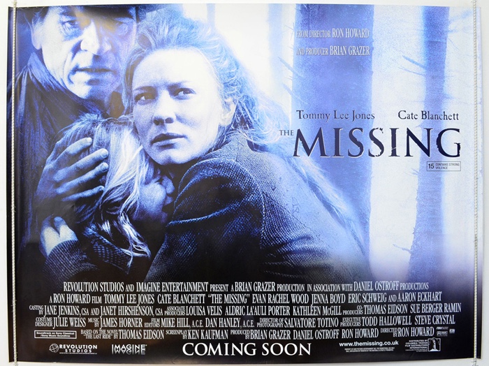 I’m not sure why a gorgeous, thrilling horror/western/adventure like Ron Howard’s The Missing didn’t win over audiences as much as it should have upon release, but it’s one of my favourite in the genre, the best film overall from Howard (IMHO) who has always felt like an uneven, ‘play it safe’ Hollywood filmmaker to me and one of my go-to films to revisit. This films plays it anything but safe, blanketing a very personal, desperate set of protagonists and their struggles with a cloak of menace, mysticism and marauding danger around every corner of a threatening New Mexico brush-scape. Cate Blanchett gives one of her most raw, affecting turns as single rancher and single mother Magdalena Gillekson, a woman with a great deal of trauma in her past who is simply trying to live the isolated homesteader life and raise her two daughters (Jenna Boyd and Evan Rachel Wood) right, with the help of her friend, ranch-hand and sometimes lover Brake (Aaron Eckhart). Their lives are first upheaved with the reappearance of her ne’er do well father Samuel (Tommy Lee Jones), a halfbreed nomad who is disgraced most people in his past, and then with the arrival of a terrifying witch-doctor (Eric Schweig) who kidnaps her eldest daughter and makes off with his gang of Apache and white human traffickers towards the Mexican border to sell her and a whole bunch of other girls they’ve taken. So begins a journey of reconnaissance, rescue and reconciliation as Magdalena, Samuel and the younger daughter voyage across wintry plains of New Mexico into barren badlands to square off with this evil cabal of predatory psychopaths and return the stolen girls to their homes. These two characters that Blanchett and Jones play fascinate me; she’s cold, bitter and has clearly been robbed of some of her humanity in the past. He’s an outcast loner with a life story so dysfunctional that his Native name literally translates into English as ‘shit for luck.’ Their struggle to salvage any kind of father daughter relationship between them is almost as daunting as the brutal rescue mission they undertake, and the narrative pays just as much careful attention to character development and human interaction as it does to action and violence. Schweig is utterly despicable as the evil Apache shaman, a hateful, volatile, ugly as fuck rotten bastard monster who haunts the film like the very wind over the terrain itself with his unholy magic spells and sudden outbursts of shocking violence. The supporting cast is full of rich talent including Elizabeth Moss, Steve Reeves, Jay Tavare, Ray McKinnon, Max Perlich, Simon Baker, Clint Howard and a surprise cameo from Val Kilmer. As good as everyone is overall, my favourite performance of the film goes to Jenna Boyd as the youngest daughter.. it’s hard enough to find child actors who will be able to to the minimal amount of believable emotion in a role like this, but she is uncannily talented and her potent terror, fierce resilience and undimmed love for her mother and sister woven into her work simply knocked me flat. The late James Horner composes a score that tops the list of prolific work from him for me, an ambient collection of classic yet somehow eerie western motifs that play along the sideline for the first two acts and then swell with orchestral release later when the finale rolls around. Cinematographer Salvatore Totino makes spooky use of the wide open vistas, craggy, labyrinthine geological structures and captures the rugged natural beauty of the region splendidly. I wish Howard would do more edgy, off the beaten path and thoroughly dark pieces of work like this because for my money he’s never been better. Perhaps that’s why this wasn’t received so well though, it’s a harrowing far cry from what we’re used to seeing in Hollywood westerns, full of black magic, dark deeds, horrifying imagery and bloody, unforgiving violence. It has a soul too though, present in the bittersweet relationship between its main characters and the ruthless resolve they fuel in each other to seek retribution against the forces of darkness at their door. This is a great film and don’t let anyone tell you otherwise, I think it was just either misunderstood, ahead of its time or people simply couldn’t reconcile the heavier aspects. I’ve recently acquired the only existing Blu Ray put out by Shout Factory which is an absolutely gorgeous release that includes an extended version with twenty minutes more footage that enriches and deepens this story wonderfully. One of the best films of the last two decades.