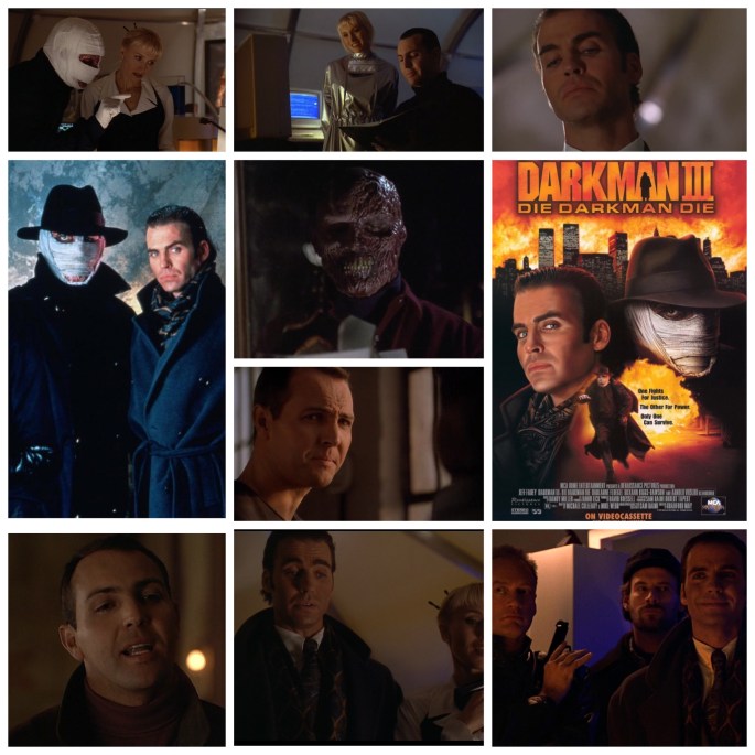 Sam Raimi made comic book cinema history with his gritty Darkman, which was solid entertainment, but the real dark and demented side of the franchise came through on the two sequels, which tossed aside stalwart leading man Liam Neeson as the titular antihero and went for offbeat, edgy character actor Arnold Vosloo (Imhotep in Stephen Sommer’s The Mummy) as the doomed Dr. Peyton Westlake, a once brilliant and handsome scientist reduced to a disfigured, monstrous vigilante known as The Darkman. Raimi’s film played it with a mix of straight and subversive, going for the underdog hero approach, while the third sequel, which is my favourite, is literally called Darkman III: Die Darkman Die, because someone at the studio boardroom table had too much caffeine and brainstormed the shit out of that abrasively hilarious title. Dr. Westlake is still doing his research on synthetic skin and skulking out there in the night pilfering supplies from random warehouses, one of which he’ll wish he didn’t mess with. Enter tyrannical, psychopathic drug lord Peter Rooker, played with moustache twirling, freaky panache by Jeff Fahey. Said warehouse belonged to him, and now he’s zeroed in on Darkman and his super strength abilities, shrewdly trying to pirate them for his organization’s nefarious deeds. The two wage a bloody war, with both of their families as collateral damage in between, an exploitation palooza of trashy, effects oriented fun. The first two films housed the villain Durant, embodied by inherently weird looking actor Larry Drake, who left big shoes to fill. Fahey seems to know this and plays up every campy aspect of this scumbag, his greased back hair lit perfectly, every mannerism an over-pronounced, garish villainous flourish to be savoured. I think the very concept of Darkman suits the tasteless excess of these two sequels better than it does Raimi’s upright origin story, as classic as it is. I actually prefer the B Movie Glory approach to the material, and this third one is schlock incarnate.