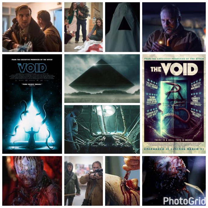 The best horror film of the year so far has arrived in the form of The Void, a genuinely spooky, deliriously gruesome 80’s throwback that gets tone, pacing and atmosphere right on the money, hitting that sweet spot that not all homages can fully grasp. It’s this year’s It Follows, I’ll put it that way. Balls out ballistic, atmospherically eerie and gorier than a chainsaw mud wrestling competition for spastics, it starts somewhat reigned in and then amps up to feverish nightmare fuel once it gets going, and boy does it ever get going. When emulating classics from distant eras, it’s important that these films find their own specific flavour and unique groove, as well as cleverly wearing influences on their sleeve. There’s an obvious adoration for John Carpenter’s The Thing running through it like an undercurrent, but the filmmakers find their own otherworldly pulse, and the fabulously icky body horror is subservient to an overarching plot involving forces from another dimension beyond ours, which a few lunatics are foolishly trying to contact. That happens later on though, once that special ripcord within the horror genre is pulled, the one that separates an uneasy opening act, a calm before the storm and the craziness to follow as soon as that first inciting attack occurs. The premise? Solid and simple: a small town cop (Aaron Poole) brings a blood soaked drifter to a nearly shut down county hospital run by a weary skeleton crew. No sooner has he arrived, bad shit starts happening. Some of the night staff go madly insane and start lobbing their own body parts off, while white cloaked cult weirdos gather outside to prevent anyone from leaving the building. A gruff, shotgun toting badass (Daniel Feathers) breaks in and pretty much violently threatens anything that moves. Corpses come alive and transform into glistening, pulsating piles of aborted pizza pocket waste, and to use the time honoured slogan, ‘all hell’ quite literally breaks loose. The head doctor (veteran character actor Kenneth Welsh, aka Windom Earle, is devilishly scary) clearly knows more than he lets on, and the new bodies pile up on the rotting older ones as dark forces gather for some kind of… birth. The actual how’s and whys of the story are left appropriately vague, as is tradition in hectic 80’s creature features with a supernatural twist. The term ‘void’ is never mentioned by anyone, rather hinted at by glimpses of a dreamy, austere parallel dimension that calls to mind everything from Altered States to Beyond The Black Rainbow to The Cell. A buddy of mine referred to the film as “Carpenter Fanboy Porn”, and while that’s definitely one angle you can look at it from, there’s more than just that, if you widen your gaze. It’s clearly a love letter to the man and his work, but it has its own thing going on as well, and feels at once as fresh as the titles it looks up to must have when they came out, and as lovingly nostalgic as a throwback piece should. The filmmakers have deliberately left it open for a sequel as well. Bring on the franchise, I say, the genre can really use stuff like this to fill the Void.