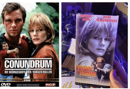 So here’s a fun idea (I hope)… I have hundreds of unwatched, obscure VHS tapes ive collected over the years and I’ve recently organized them, fired up the VCR and begun to explore the darkest corners of Z-Grade 70’s, 80’s and 90’s analog nirvana, so I’ll do a series of intermittent reviews based on these random, unheard of treasures with a snapshot of the tape itself, just for fun. First up is one called Frame By Frame, which I guess is officially called Conundrum on IMDb. It stars Michael Biehn and Marg Helgenberger as two inner city cops who begin to have a fiery affair amidst the aftermath of gangland killings stirred up by a Chinese crime syndicate. His family is murdered to set an example, this event brings them closer as she comforts him but before you know it other nasty secrets are unleashed and the classic obligatory ‘web of deceit, betrayal, twists and kinky obsession’ of the essential 80’s B movie potboiler is set into motion. Biehn and Helgenberger are perfect for each other, and on top of being two of the absolute sexiest cult icons of their day, they actually turn this run of the mill script into something fun thanks to their vivid characterizations. He’s as wild eyed and frantic as he was in Terminator and even gets one sly ‘big emotion’ scene that takes on new meaning once all the twists unfold, and she does this tough girl tomboy thing with her accent and mannerisms that’s fun too. The story kind of goes wildly all over the place and I didn’t quite follow every hairpin turn or believe in this brand of convolution but hey, it’s an ancient DTV flick and half the fun is watching these two stars rip snort their way through the hard boiled narrative anyways. I’m fairly sure I may be the only person to have ever seen this film because the tape I have is one of those promotional screeners that aren’t for resale (but they always are anyways), there are positively zero user reviews on IMDb or even critics reviews out there elsewhere on the interwebs and one can barely find traces of its existence at all beyond the tape I have. Good times though, especially if you love Biehn and Marg as much as this viewer.