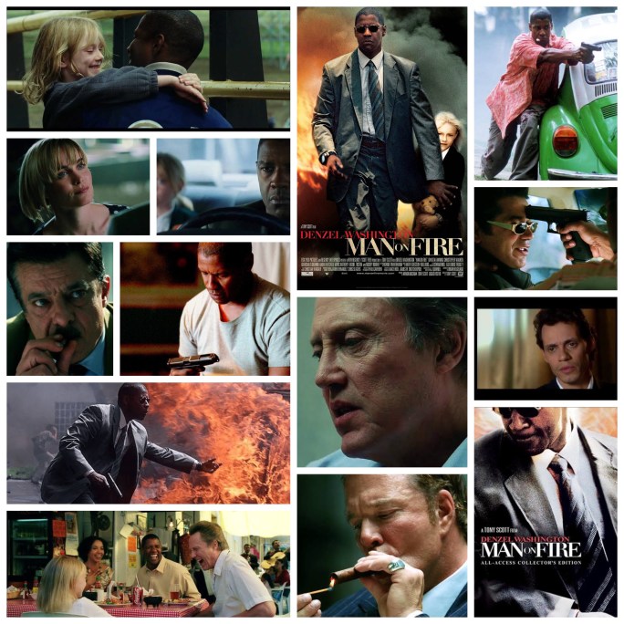 Tony Scott’s Man On Fire is one of those films I can watch time and time again and never tire of, a magnificently melancholy tale of South of the border justice, criminal intrigue and a tequila shot of pulpy, blood soaked style that gets me every time. It’s loosely based on a 1987 film of the same name starring Scott Glenn, Jonathan Pryce, Danny Aiello and Joe Pecshi (there’s a random lineup, no?), but Scott intrepidly branches off into his own territory, and thank god for his vision. This was the first film in which he really explored his sketchy smokehouse of an aesthetic that he would later take to angelic heights with Domino. Colors blur and saturate, editing rockets by with the force of a bullet in a storm, subtitles appear arbitrarily and seemingly of their own volition. It’s a jarring tool set that he employs, and many abhor it. I’m as in love with it as he was though, and whether to throw us right into the protagonist’s psyche or simply because he felt the need to paint his pictures this way, the rest of the films in his remaining career carried the DNA, in varying doses. Fire is the key word for this film, in many of it’s forms. There’s a smoldering ember in Denzel Washington’s John Creasy that is fed by the winds of corruption as the film progresses, erupting into a blazing inferno of violence and fury. Creasy is a broken man, haunted by the questionable, never fully revealed actions of his military past. “Do you think God will ever forgive us for what we’ve done” he grimly asks his old war buddy Rayburn (a scene stealing Christopher Walken). “No” Rayburn ushers back curtly. It’s at this heavy nadir we join Creasy, lost in a sea of alcohol and guilt, an unmooored ship with a shattered hull looking for both anchorage and repair. Rayburn hooks him up with a bodyguard gig in Mexico City, keeping the young daughter of a rich businessman (Marc Anthony, terrific) safe from the very real threat of kidnapping. Dakota Fanning is compassionate, precocious and endearing as young Pita, who spies the wounded animal in Creasy right off the bat and tries to make friends. Creasy draws back in reluctance, but eventually warms up. I love the pace of this film to bits. It spends nearly half of its hefty running time simply getting to know these two characters, forging a bond between them before the inciting incident even looms on the horizon. And when the kidnapping occurs, as it must, the stakes are high as can be and our investment level in the situation is paramount. Setting up character is so key, and Scott nails it with scene after scene of quiet and careful interaction. Then he yanks the lid off the pot, as Pita is snatched in broad daylight, Creasy is injured and the kidnappers vanish into thin air. Pita’s mother (a soulful Radha Mitchell) works with the dodgy Mexican authorities and her husband’s lawyer Jordan (a sleazy Mickey Rourke). Creasy has other plans. Once healed, he embarks on a mission of fury and vengeance, knocking down doors, removing body parts, inflicting gratuitous bodily harm and using every technique in his training (believe me, there are some interesting ones) to track down those responsible and get Pita back. Washington does all this with a calm and cool exterior, letting the heat emanate from every calculated syllable and intense glare. The descent into Mexico City’s poverty stricken criminal underworld is a grisly affair, and all sorts of ugliness is exposed, shredded through the caffeinated prism of Scott’s lens. Two cops do what they can to help Creasy, idealistic Guerrero (Rachel Ticotin) and battle hardened Manzano (the always awesome Giancarlo Gianninni). It’s Creasy’s show though, and he blasts through it like a righteous hurricane of blood and bullets. Scott’s films have a knack for ending in over the top, Mexican standoff style shootouts, but the man subverts that here, going for something far more sorrowful and atmospheric, ending an intense tale on notes of sadness and resolute calm, gilded by the aching tones of songstress Lisa Gerrard and composer Harry Gregson Williams. Walken provides both comfort and catharsis, the only beacon of hope for Creasy other than Pita. Unlike John, Rayburn has moved on from the horrors of their past, but one still sees the trauma in his soul when he looks John in the eye and gets hit with what is reflected back. Tough stuff to get right, but hey, it’s Walken we’re looking at here, and he’s brilliant. Rourke has little more than an extended cameo, but his flavor is always appreciated, and he’s great too. I had no idea Anthony had the chops he exhibits here, but I loved his arc as well as his performance and he holds his own in a blistering scene with Washington. Washington is an elemental beast, shadowing what’s left of his humanity under a cloak of booze and brooding contemplation, until he’s coaxed out by the life saver Pita. Then he’s a lion, riding guns out into a ferocious swan song of a sunset that may just hold rays of redemption for him. This is Scott at his best, his unique brand of storytelling at its height, his creative juices a canister of lighter fluid set aflame with genius and innovation. A masterpiece.