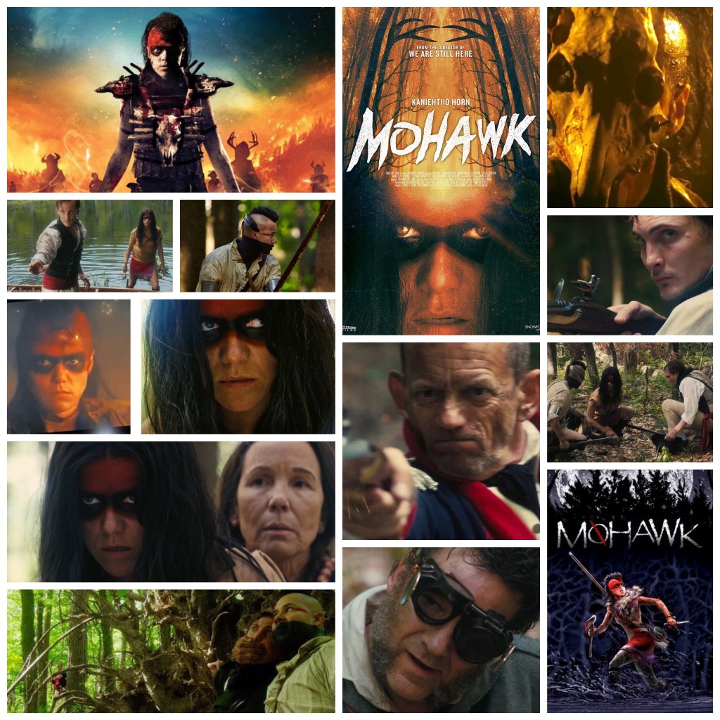 Some films just place you right into the action without a moments setup, exposition or prologue, they just ruthlessly air drop you right into a furious bedlam of urgency and incident with nary a moment of narrative foreplay or warmup and I love them for it. Ted Geoghegan’s Mohawk is a breathless, unconventional and altogether brilliant horror/western hybrid (my favourite genre amalgamation) that tells the tale of young Mohawk woman Okwaho (Kaniehtiio Horn) fighting alongside her two lovers against a vicious regiment of American soldiers hellbent on her destruction as her Mohawk elders try to retain the tribes neutrality amidst a nasty personal vendetta on both sides. Peace and neutrality unfortunately just weren’t in the cards for the early days of America and the hatred, rage, violence and conflict of it all are reflected in this lean, mean, taught, streamlined and spectacularly thrilling piece of esoteric escapist exploitation that I have fallen in love with and immediately ordered the DVD. Horn is actually part Mohawk herself and owns the role with intimidating physicality and stoic yet emotional resolve, I’ve seen her work in Letterkenny and noticed her in Brandon Cronenberg’s Possessor earlier this year, she’s one to watch out for. Okwaho’s two lovers are a fierce fellow Mohawk named Two Rivers (Justin Rain) and young British officer Joshua (Eamon Farron, who we remember as the evil Richard Horne in Twin Peaks: The Return). She does her best to protect them and the entire time she’s forced to run, fight and survive she is also with child, which makes for one intense character arc. The American soldiers are a mottled, complex bunch led by a cold, hard bastard of a captain played by the otherworldly looking Ezzra Buzzington in a performance of terrifying sadism, unabashedly verbose fury and curiously contradictory rationality that makes him a believable character with dimensions as opposed to a villain composed simply of leering caricature. This is in contrast to his second in command who is a gruff, racist asshole with headgear that Ichabod Crane would be proud of, played by Robert Longstreet who was so good as the groundskeeper in Haunting Of Hill House. I’ll be honest, not everyone is going to love this film: it’s severely low budget which is noticeable, it does this tightrope walk between brutal splatter horror sensibilities and eerie, surreal mysticism that might not work for every viewer and it may just be too much of a nerve wracking gauntlet for some to get through and keep up with the pace, violence and mile-a-minute sociopolitical flourishes peppered into the colourful, detailed dialogue. The things I’ve mentioned are all part of what made me appreciate this film though; the stirring opening credits scooped me up and threw me right into the action, the emotional core of Okwaho and her two lovers kept me caring for them even when action took over for character development a bit, the dastardly nature of the soldiers and preening theatricality of Buzzington’s villain was engaging, the audaciously unapologetic violence and surging momentum literally had me putting down my phone and hovering on the edge of my seat in rapturous tension. Not to mention the gorgeous, propulsive, dark-synth laden score by Wojciech Golczewski that keeps mood, atmosphere, menace and emotion thrillingly alive and pulls the slack shockingly tight for the duration of the film until it’s unbelievably fearsome climax. If you love sweeping, emotional stuff like Last Of The Mohicans but you also appreciate mean, fucked up, grisly horror tinged westerns like Bone Tomahawk you’ll dig this absolutely terrific film.