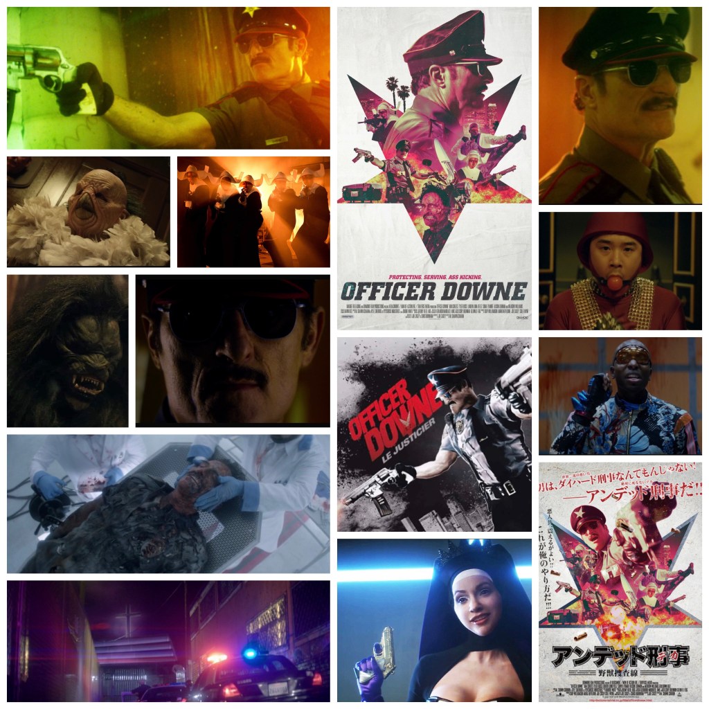 Officer Downe is one of those hyper violent, weirdly sleazy, in your face trashy midnight madness flicks that although I couldn’t in good faith recommend to most people, it definitely leaves an impression on the nervous system, if not altogether frying it to a crisp. Based on a graphic novel, it tells of hotshot inner city cop Officer Downe (Kim Coates), a legendary crime fighter in a borough so ridden with filth and scum it’s amazing the infrastructure hasn’t just completely collapsed. Downe has one key skill in getting his job done: he can’t be killed. Well, he technically can, but each time he’s shot to shreds, eviscerated by explosives or mauled by careening vehicles he’s resurrected in the secret labs below the police precinct using bizarre necromancy and mad science only to fight, die and live all over again. This talent makes him the target of a whole galaxy of increasingly weirder criminal factions including animal mask wearing kingpins called the Fortune 500, a Kung fu supervillain called Zen Master Flash (Sona Eyambe) and a cabal of murderous, voodoo wielding, arms dealing nuns led by the always awesome Alison Lohman, who had prior been laying low for a while and chooses quite the random project in which to make her comeback. Downe is watched over by a team of beat cops hired to babysit and clean up after him, and so the broad, crazy, cacophonous story goes. Coates is a hell of an actor, he’s always been one of my favourites and he tears into this role with a campy ferocity and deadpan humour that’s a lot of fun, plus it’s nice to see a guy like him who has compiled an impressive career in supporting turns get a juicy comic book lead role. At some points it feels like the story is a bit too much about the human cops tailing him, none of whom are interesting characters, when it probably should have been more about him. The film feels like this furiously deranged mix of Sin City, Robocop, Maniac Cop and Hobo With A Shotgun all stuffed in a blender and served up on a shoestring budget, take it or leave it. Many will hate it, it’s wantonly trashy, so silly it’ll melt brains and so hyperkinetic in visual and editing techniques it’ll explode eyeballs, but there’s a feverish manic energy I appreciated, and Coates does give it his all and is clearly having a fuck load of fun in this role.